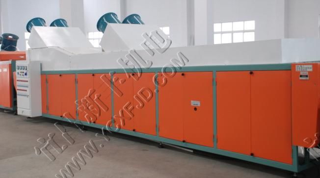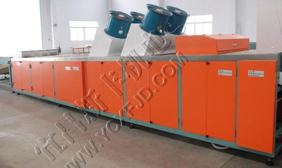 熱風機換能器單獨布置,提高熱效率,經干燥后的熱風經過風機加速直接送進干燥道,通道內空氣濕度低于25%,溫度不均勻度不超過±2℃。柴油燃燒機采用意大利產品,提高了干燥系統運行的可靠性。采用高穩定性的溫度控制器和傳感器,克服了普通控制器不穩定帶來的溫度慣性和漂移,最終使干燥道溫度恒定在設定范圍內(建議設定值:上限為30℃,下限為26℃)。